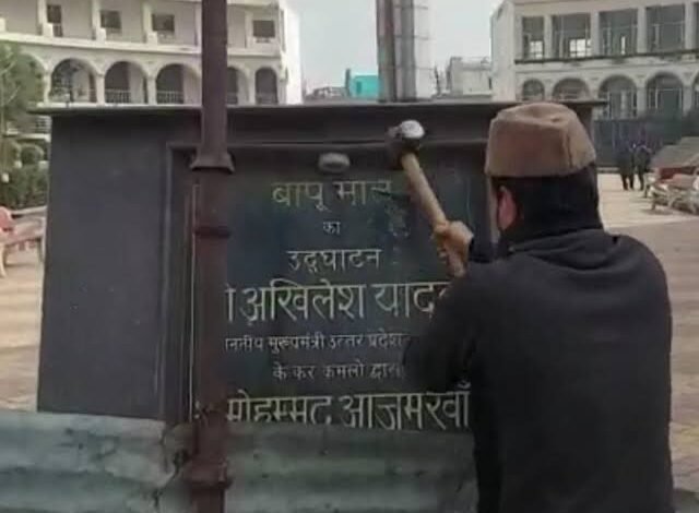 अखिलेश यादव-आजम खां के नाम का शिलापट तोड़ने का मामला गरमाया, सपाईयों में उबाल