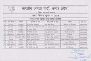 पिछड़ा वर्ग की महिला के लिए आरक्षित फिरोजाबाद नगर निगम महापौर पद पर पार्टी की कार्यकर्ता कामिनी राठौर को प्रत्याशी बनाया है। अनुसूचित जाति महिला के लिए आरक्षित आगरा नगर निगम महापौर पद पर पूर्व विधायक हेमलता दिवाकर को प्रत्याशी टिकट दिया है। पिछ़ड़ा वर्ग के लिए आरक्षित सहारनपुर नगर निगम महापौर पद पर चिकित्सक डॉ. अजय कुमार को प्रत्याशी बनाया है। मथुरा- वृंदावन नगर निगम में महानगर अध्यक्ष विनोद अग्रवाल को टिकट दिया है। अनुसूचित जाति के लिए आरक्षित झांसी नगर निगम महापौर के पद पर पूर्व विधायक बिहारी लाल आर्य को प्रत्याशी बनाया है।