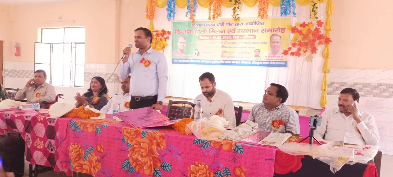 चौरी चौरा/गोरखपुर। आज दिव्यांग क्लब चौरी चौरा द्वारा आयोजित दिव्यांग होली मिलन एवं सम्मान समारोह का आयोजन मंगल भवन मुंडेरा बाजार में किया गया जिसमें लगभग सैकड़ों दिव्यांग जन (महिला पुरुष) ने भाग लिया उक्त कार्यक्रम के मुख्य अतिथि मा० संदीप कुमार मौर्य जिला दिव्यांगजन सशक्तिकरण अधिकारी गोरखपुर मा० वेद प्रकाश मिश्र जिला समाज कल्याण अधिकारी गोरखपुर।विशिष्ट अतिथि श्रीमती सुनीता गुप्ता नगर अध्यक्ष मुंडेरा बाजार डॉ0 उमेश चंद्र किरण प्रभारी जिला दिव्यांग पुनर्वास केंद्र गोरखपुर रहे।