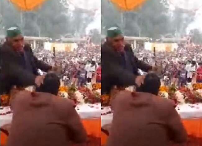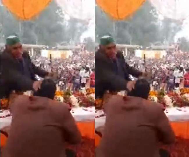लखनऊ।शुक्रवार शाम इंटरनेट मीडिया पर एक वीडियो तेजी से वायरल हुआ। इस वीडियो में एक मंच पर बैठे सदर विधायक को भारतीय किसान यूनियन के एक बुजुर्ग कार्यकर्ता ने थप्पड़ मार दिया। जिसके बाद उनके सुरक्षा कर्मी थप्पड़ मारने वाले वृद्ध को पकड़ कर मंच के नीचे ले गये हैं। बताते हैं घटना के बाद काफी सनसनी फैल गई। हालांकि बाद में हमलावर दिख रहे भाकियू कार्यकर्ता को विधायक ने मंच पर अपने बगल में भी जगह दी।वहीं, भाकियू कार्यकर्ता ने बताया कि उन्होंने विधायक को कोई पहली बार नहीं मारा है कई बार प्यार से मार चुके हैं। हुआ यह कि सिकंदरपुर सरोसी ब्लाक क्षेत्र के गांव जंगेनगर चौराहा पर प्रथम स्वतंत्रता आंदोलन में अमर शहीद गुलाब ङ्क्षसह लोधी की आदमकद प्रतिमा की स्थापना बुधवार को सदर विधायक पंकज गुप्ता ने कराई थी। इसी प्रतिमा का अनावरण समारोह आयोजित हुआ। सांसद साक्षी महाराज ने प्रतिमा का अनावरण किया। इसी समारोह का एक वीडियो शुक्रवार देर शाम इंटरनेट मीडिया पर तेजी के साथ वायरल हुआ। इस वीडियो में दिखाया गया कि एक बुजुर्ग जो हाथ में लाठी और सिर पर भारतीय किसान यूनियन की हरी व सफेद टोपी पहने हुए पहुंचा। विधायक पहले पीछे की तरफ देख रहे थे। बुजुर्ग के सामने आते ही उन्होंने उसके चरण स्पर्श किये। तभी वृद्ध ने उनके थप्पड़ मार दिया। यह देख वहां मौजूद सुरक्षा कर्मियों ने बुजुर्ग को पकड़ लिया और मंच से नीचे ले गये। इस बीच विधायक ने अरे, अरे भाई, अरे क्या हुआ, अरे वो क्या हुआ… बोलते हुए वृद्ध को वापस बुलाने का प्रयास किया। लेकिन सुरक्षा कर्मी उसे लेकर चले गए। इस बीच मंच पर सांसद साक्षी महाराज व अन्य लोग मौजूद रहे। थप्पड़ मारने वाले वृद्ध का नाम छत्रपाल यादव है। जो भाकियू कार्यकर्ता हैं। बताते हैं कि इसके बाद वृद्ध को विधायक ने वापस मंच पर बुलाया और अपने बगल में स्थान देते हुए सम्मान दिया। इधर घटना के बाद इसका वीडियो इंटरनेट मीडिया पर वायरल हो गया।